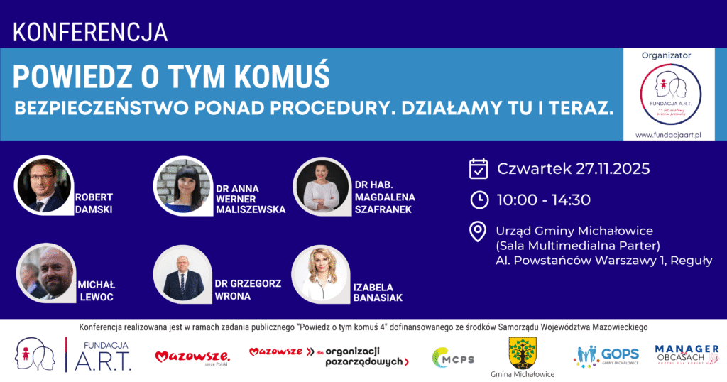 Konferencja „Powiedz o tym komuś” to przestrzeń realnej współpracy osób zaangażowanych w przeciwdziałanie przemocy i budowanie systemów bezpieczeństwa. Skupiamy się na skutecznym działaniu ponad formalizm: szybkim rozpoznaniu ryzyka, koordynacji między służbami i jasnych ścieżkach pomocy. Doceniamy codzienny wysiłek funkcjonariuszy i specjalistów, wskazujemy wyzwania, a przede wszystkim wypracowujemy rozwiązania do wdrożenia od zaraz. W centrum stawiamy czynnik ludzki — kompetencje, współpracę i empatię — bo to one przekładają się na realne bezpieczeństwo osób doznających przemocy.